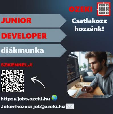 Junior fejlesztő - Diákmunka ősztől A debreceni központú Ozeki Kft. Magyarország egyik legismertebb szoftvercége. Téged keresünk, amennyiben aktív hallgatói jogviszonnyal rendelkezel programtervező-, mérnökinformatikus- vagy gazdaságinformatikus szakon, illetve elhivatott vagy a programozás, fejlesztés iránt. A munkavégzés ősztől heti 2-5 nap, és rugalmas a munkabeosztás. Van lehetőség a szakmai fejlődésre, és a csapat tagjai támogatják egymást a munkájuk során. A feladataid során számos programozáshoz kapcsolódó területet megismerhetsz, például mobilkommunikációs alkalmazásfejlesztést, modern hálózati üzenetküldési módokat, vagy peer-to-peer alapú architektúrákat. A munkavégzés otthonról történik, a saját eszközeiddel. A jelentkezésedet az alábbi e-mail címre várjuk: job@ozeki.hu Kérünk, hogy a lehető leghamarabb add le a jelentkezésedet. Bővebb leírást az állásról és a jelentkezés módjáról alábbi oldalon találsz: https://jobs.ozeki.hu/p1687-junior-developer.html